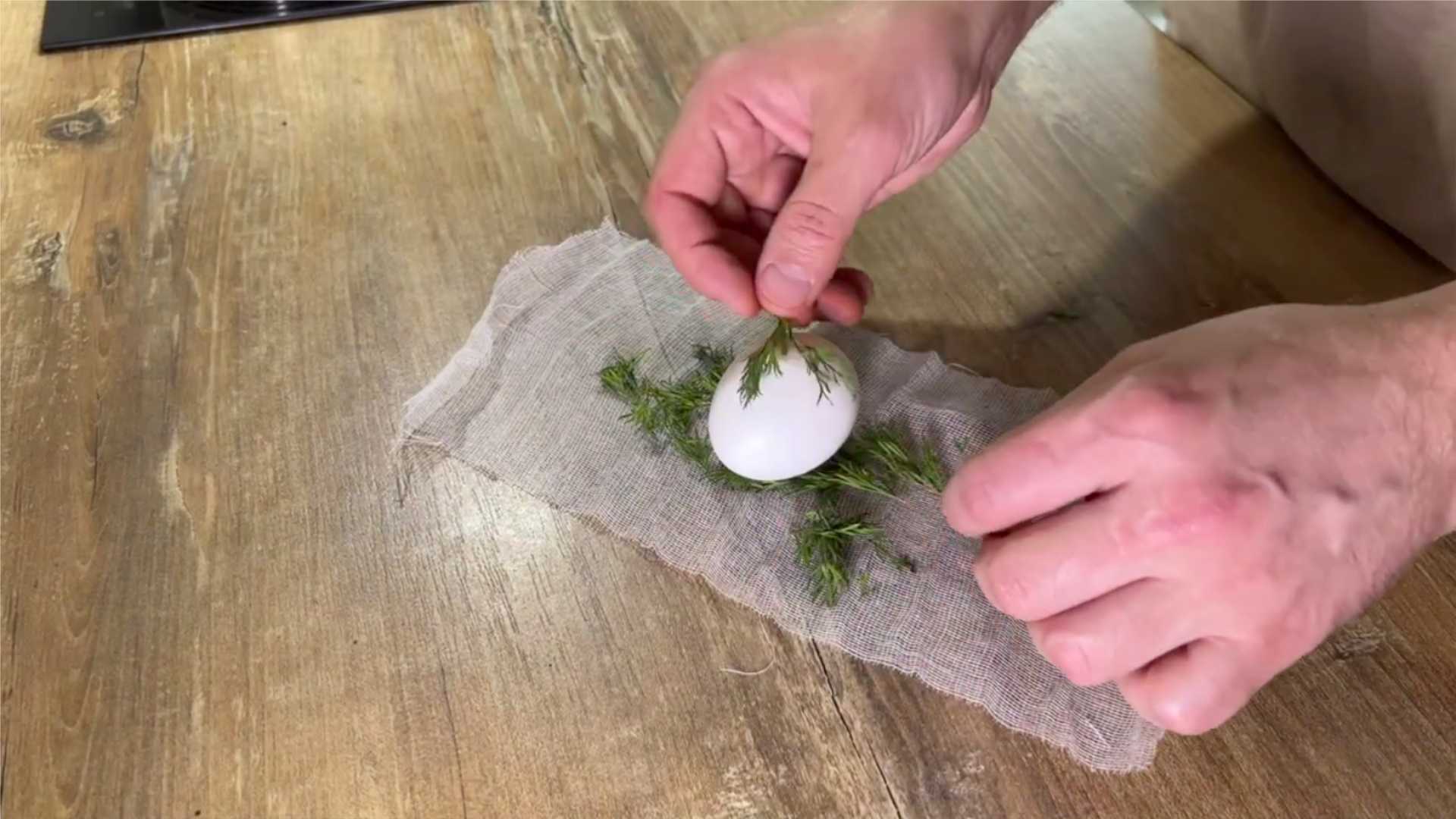 Тщательно вымойте яйца с мылом. Приложите к мокрому яйцу веточку зелени (например, укропа) или посыпьте семенами. Плотно оберните яйцо кусочком марли.