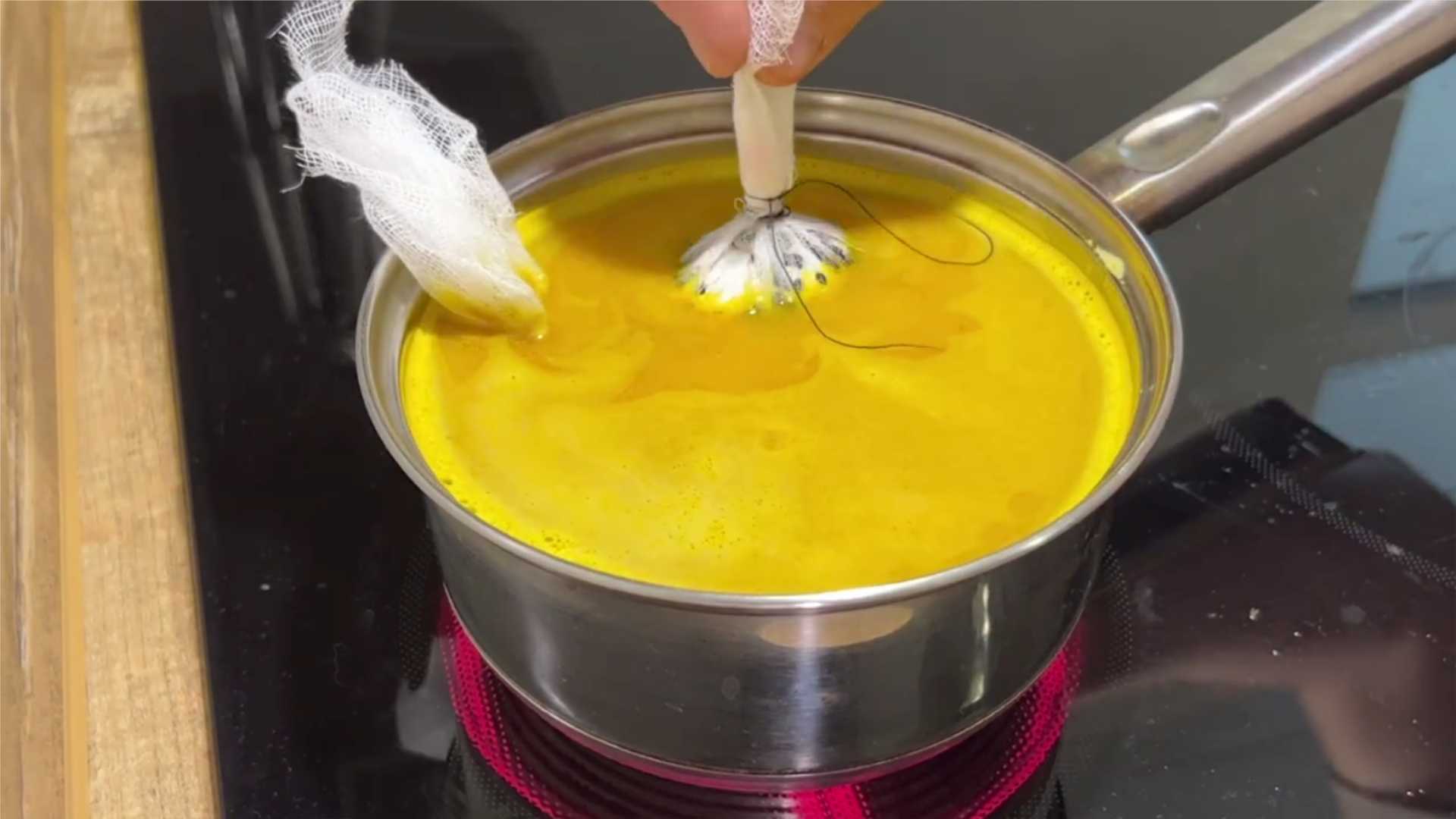 Не жалейте порошка куркумы: чем концентрированнее раствор, тем насыщеннее получится золотой оттенок.