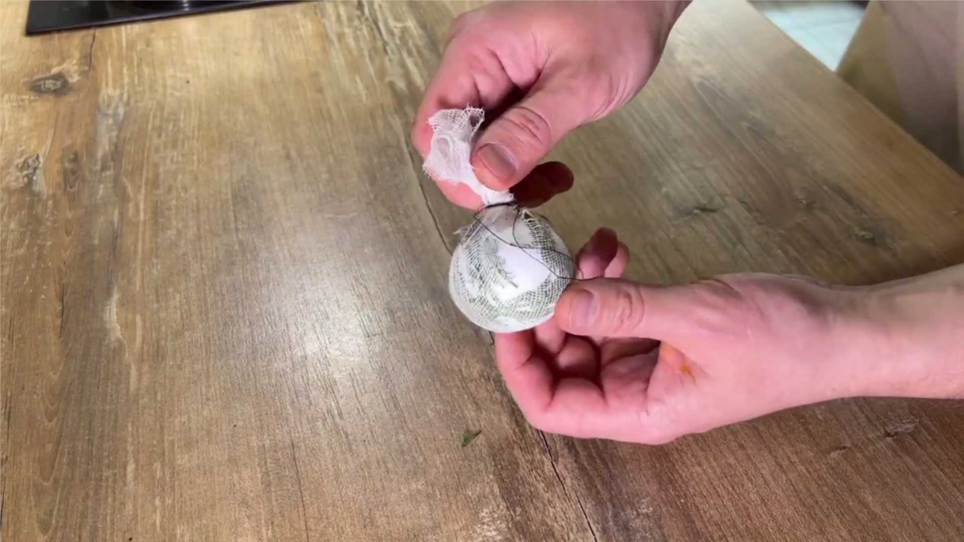 Плотно завяжите марлю узлом или ниткой, чтобы ткань плотно прилегала к скорлупе. От этого зависит чёткость рисунка после окрашивания.