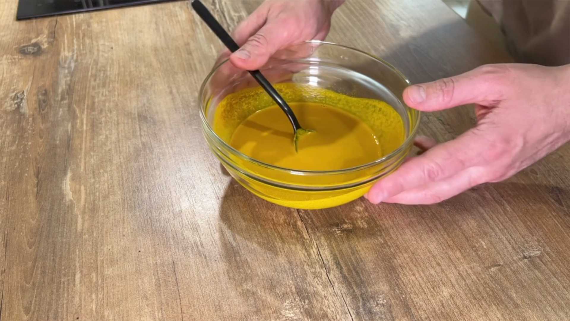 Подготовьте красящий раствор. В глубокой миске смешайте порошок куркумы с уксусом и небольшим количеством воды. Тщательно перемешайте, чтобы получилась однородная жёлтая кашица без комков.