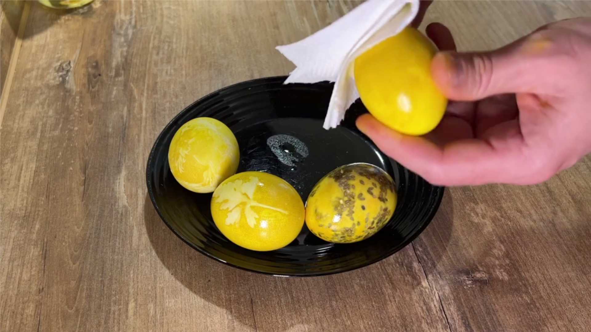 *НА ЗАМЕТКУ: Дайте остыть естественным образом, не вытирайте горячие яйца: краска ещё не закрепилась."