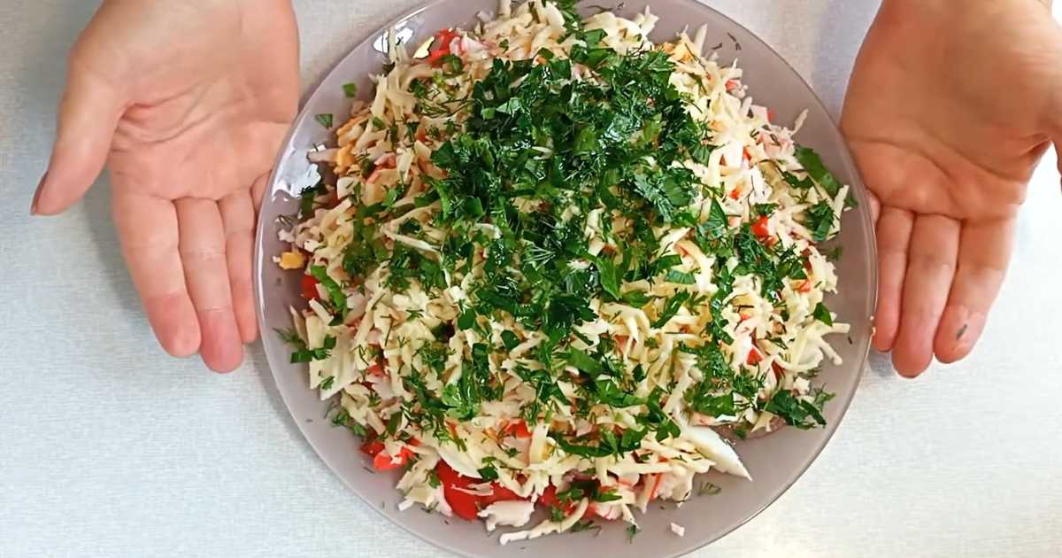 Дайте салату настояться 5-10 минут в холодильнике. За это время все вкусы успеют смешаться, а крабовые палочки немного пропитаются маслом. Этот рецепт прост в приготовлении и не требует лишних усилий.