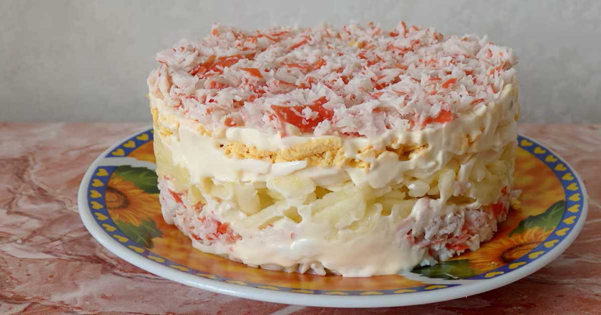 Последний слой – это снова крабовые палочки, укладываем оставшуюся половину. Последний слой с крабовыми палочками укладываем, добавляем майонез и разравниваем. Салат готов.