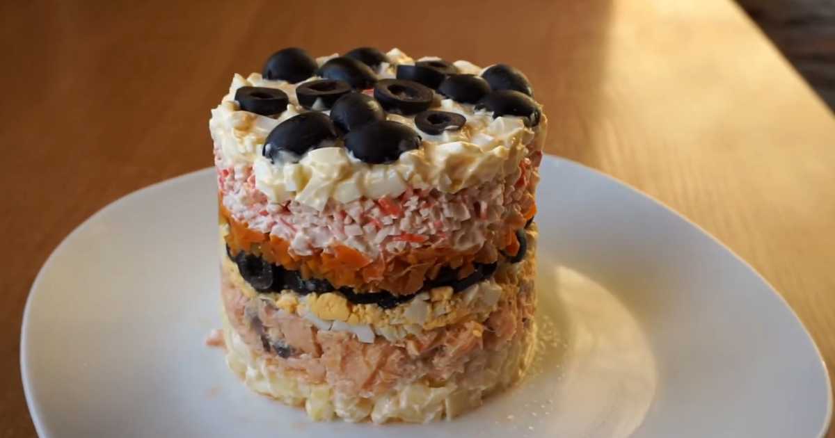 Шаг 9: (/storage/editor/recipe-1282/3UieUSytF3mdxuTHbBUGgIV6McZJzlHt747vv4ft.png) Аккуратно снимите пластиковую форму. По желанию украсьте салат маслинами. Готовое блюдо можно сразу подавать к столу или оставить в холодильнике на 15–20 минут для более насыщенного вкуса.