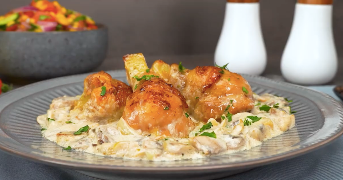 Переложите курицу с картофелем и грибами на тарелку для подачи и посыпьте петрушкой.