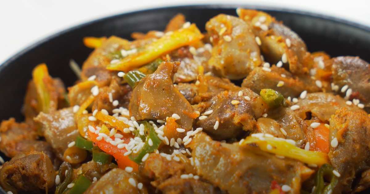 Снимите кастрюлю с желудками с плиты и слейте бульон. Пересыпьте желудки в сковороду с овощами.