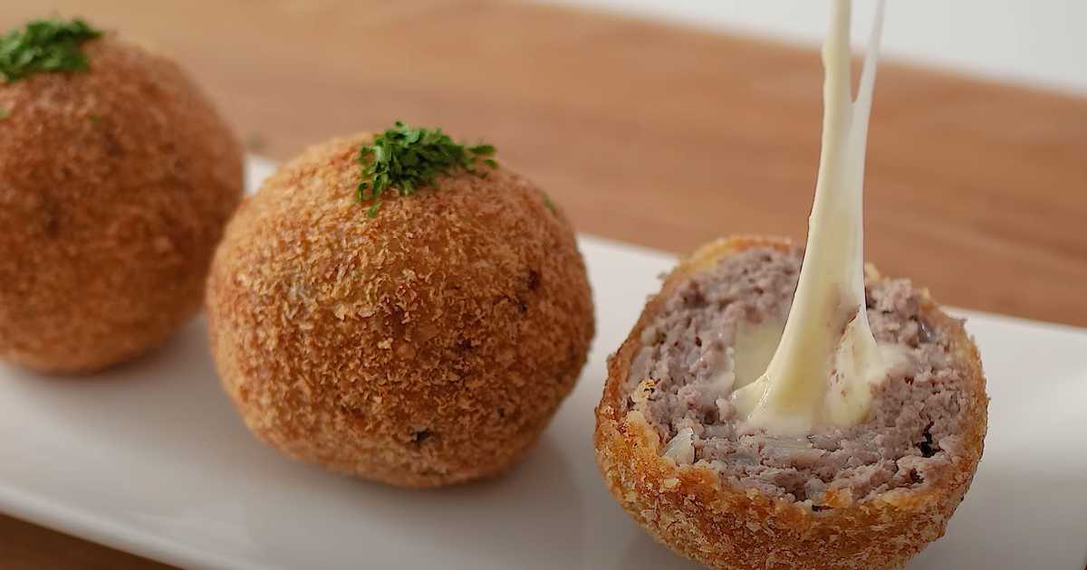 В получившуюся полость уложите порцию тертой моцареллы, закройте сыр фаршем и снова скатайте ровный шарик. Повторите все манипуляции с оставшимися порциями фарша и сыром.