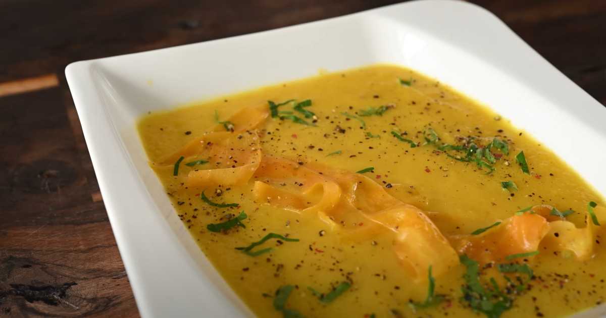 Разлейте суп по тарелкам, украсьте лентами моркови, нарезанной петрушкой и молотым перцем и подавайте.