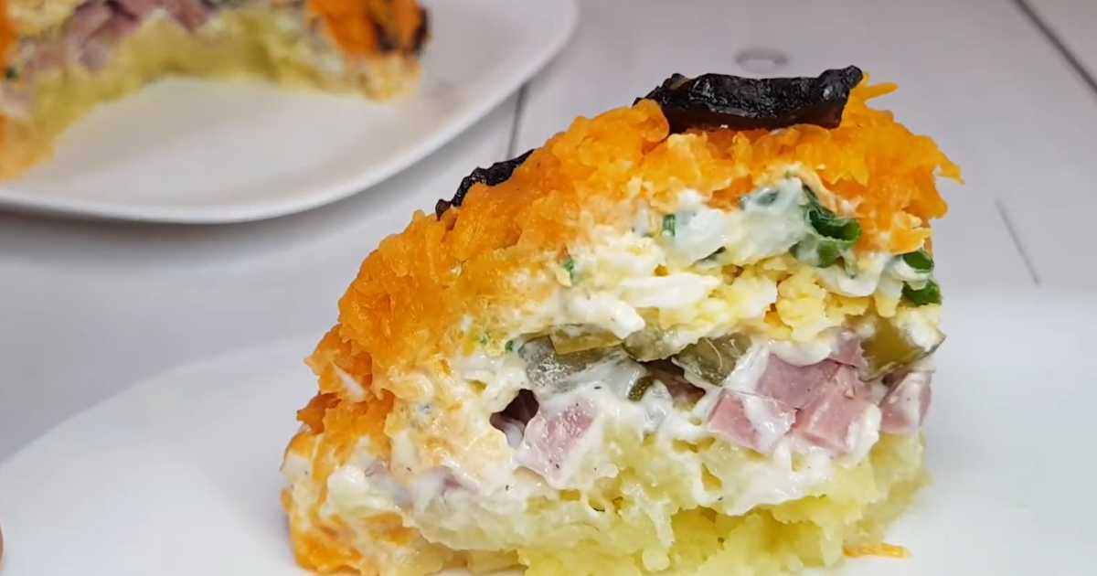 Подача: Подавайте салат охлажденным. При подаче нарезайте его аккуратными порциями, чтобы сохранить красивую форму и слоистость. Это блюдо станет настоящим центром внимания на любом празднике.