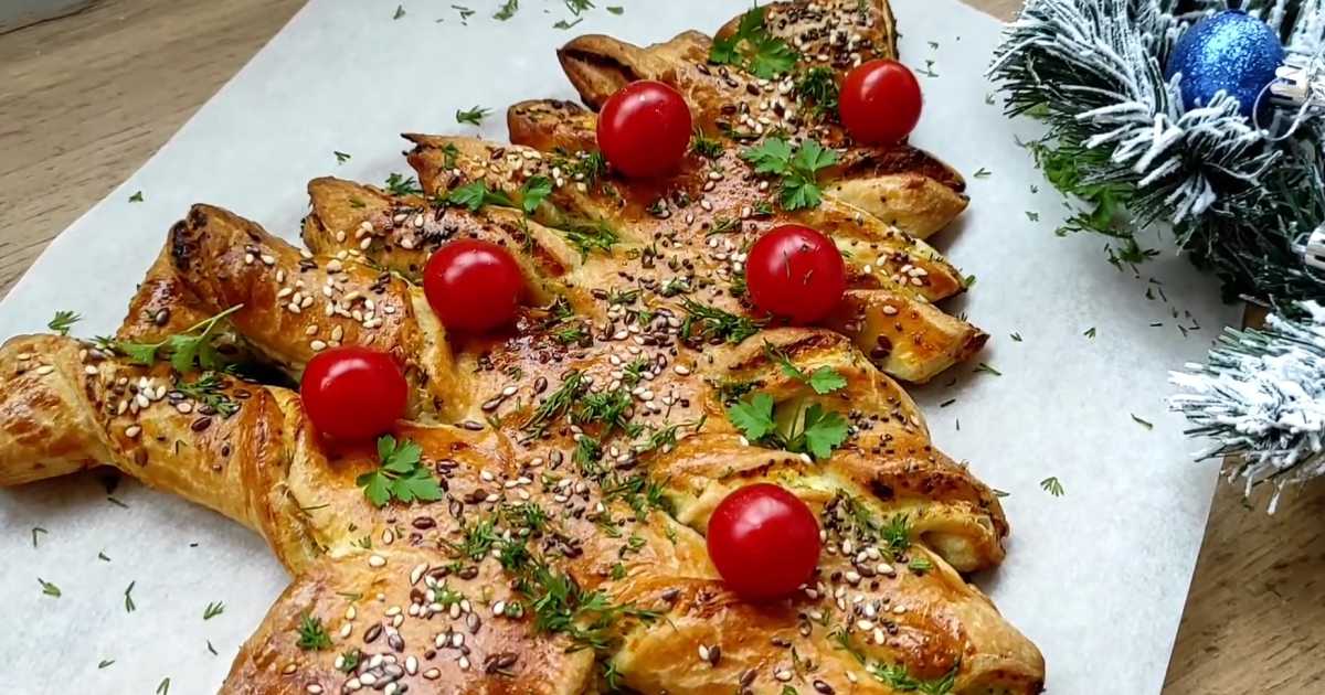 Обрежьте тесто так, чтобы получилась фигура ёлочки. Из обрезков также можно сделать закуску.