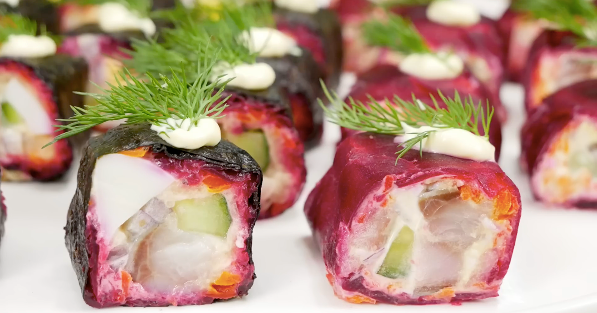 Этот рецепт — яркий пример кулинарной фантазии, которая превращает классический советский салат в изысканное блюдо в стиле суши. Роллы селедка под шубой идеально подходят для новогоднего стола, где они становятся настоящим украшением. Вместо традиционного набора ингредиентов, здесь используется нори и техника сворачивания, что делает их не только вкусными, но и визуально привлекательными.