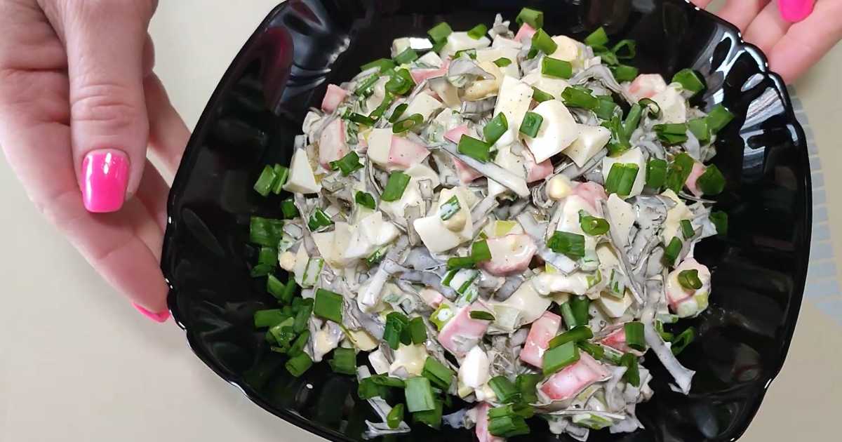 Перед подачей охладите салат из морской капусты с крабовыми палочками в холодильнике в течение получаса.