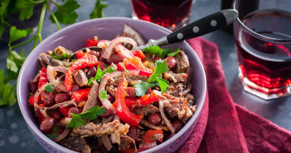 В миску выложите фасоль, говядину, сладкий перец, острый перец, орехи, лук, кинзу.