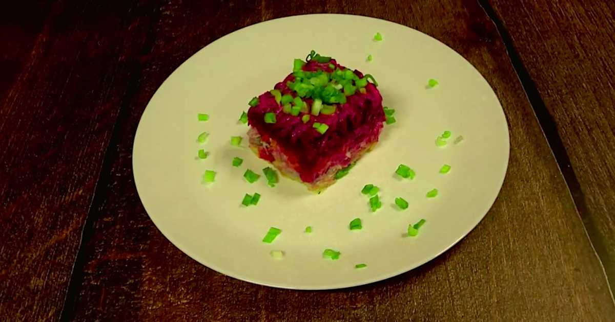 Этот салат — настоящая классика русской кухни, которую часто называют "сельдь под шубой". В этом варианте в состав не входят яйца, что делает блюдо идеальным для тех, кто их не ест. Это не просто селедка под шубой без яиц, это настоящий кулинарный шедевр, который понравится всем гостям.