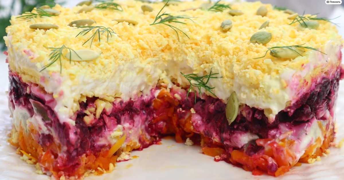 Украсьте салат: Снимите форму, посыпьте верхний слой мелко натертыми яичными желтками, украсьте семенами тыквы и зеленью.