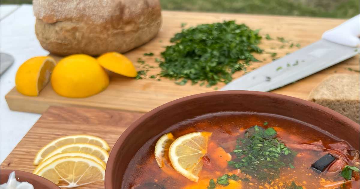 Подавайте суп горячим, добавьте в каждую порцию ломтик лимона и ложку сметаны. Лимон не только украшает, но и придает свежий аромат, а сметана смягчает кислый вкус.