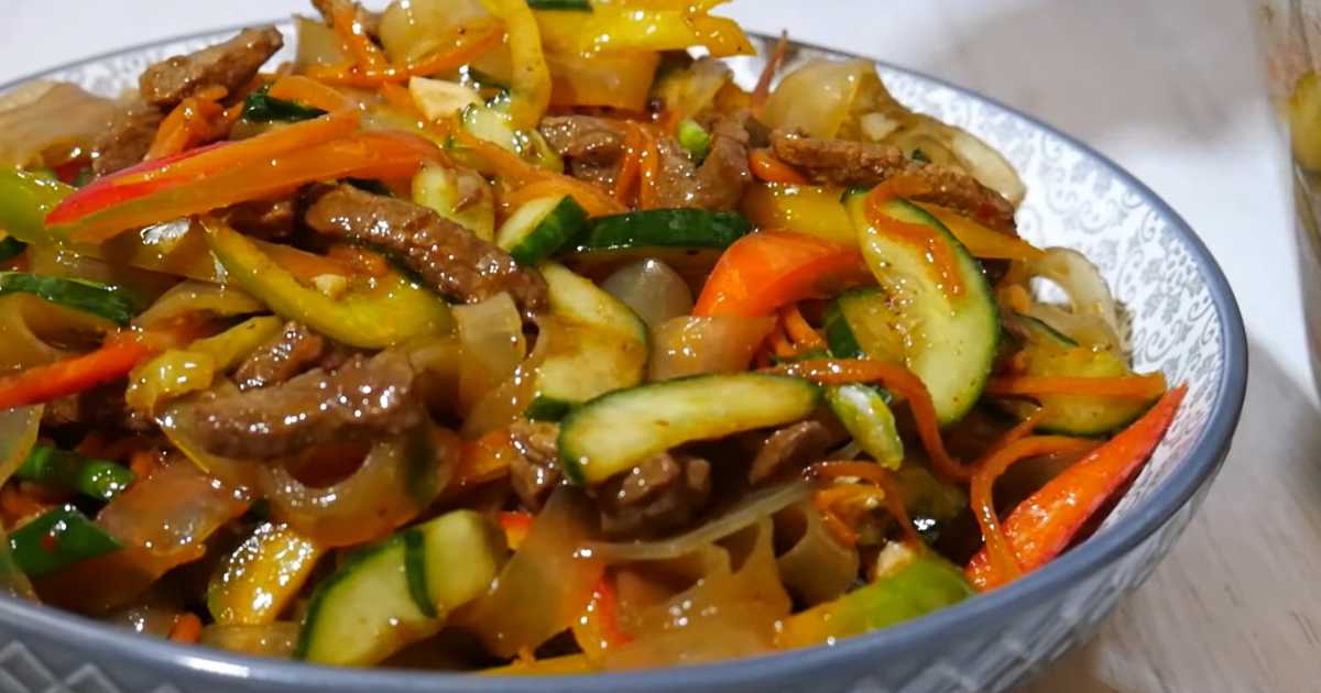 В миске смешайте лук, огурец, перец, мясо и морковь.