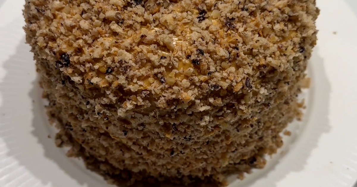 Этот рецепт — современная версия классического русского торта «Медовик», где вместо традиционных медовых коржей используются готовые бисквитные коржи (или даже печенье). В видео показано, как собрать торт из двух выпеченных коржей и покрыть его кремом из масла и вареной сгущёнки. Завершающий штрих — обсыпка мелко измельчёнными орехами. Такой торт получается нежным, ароматным и идеально подходит для праздничного стола или семейного чаепития. Готовится быстро, без лишних сложностей.