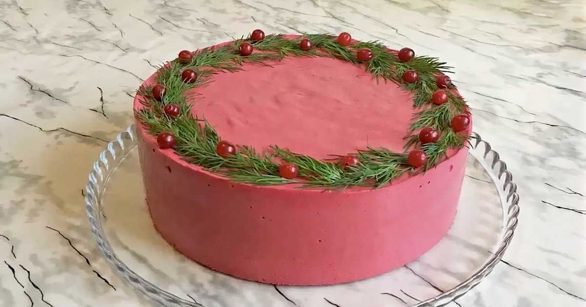 Аккуратно снимите кондитерское кольцо и бордюрную ленту. Украсьте торт укропом и клюквой.