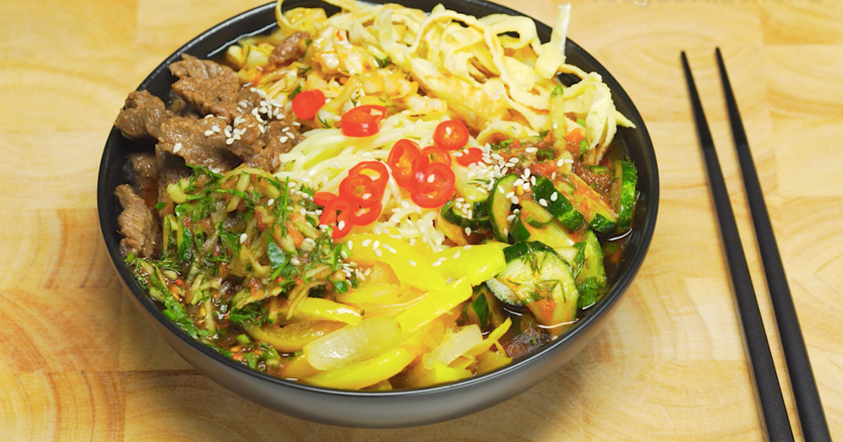 Этот холодный суп с мясом, овощами, лапшой и острыми приправами – одна из визитных карточек корейской кухни и отлично заменяет нашу окрошку и холодный борщ. Вместо кваса или кефира, ингредиенты Кукси погружены в воду с соевым соусом, винным уксусом и классическими корейскими специями.