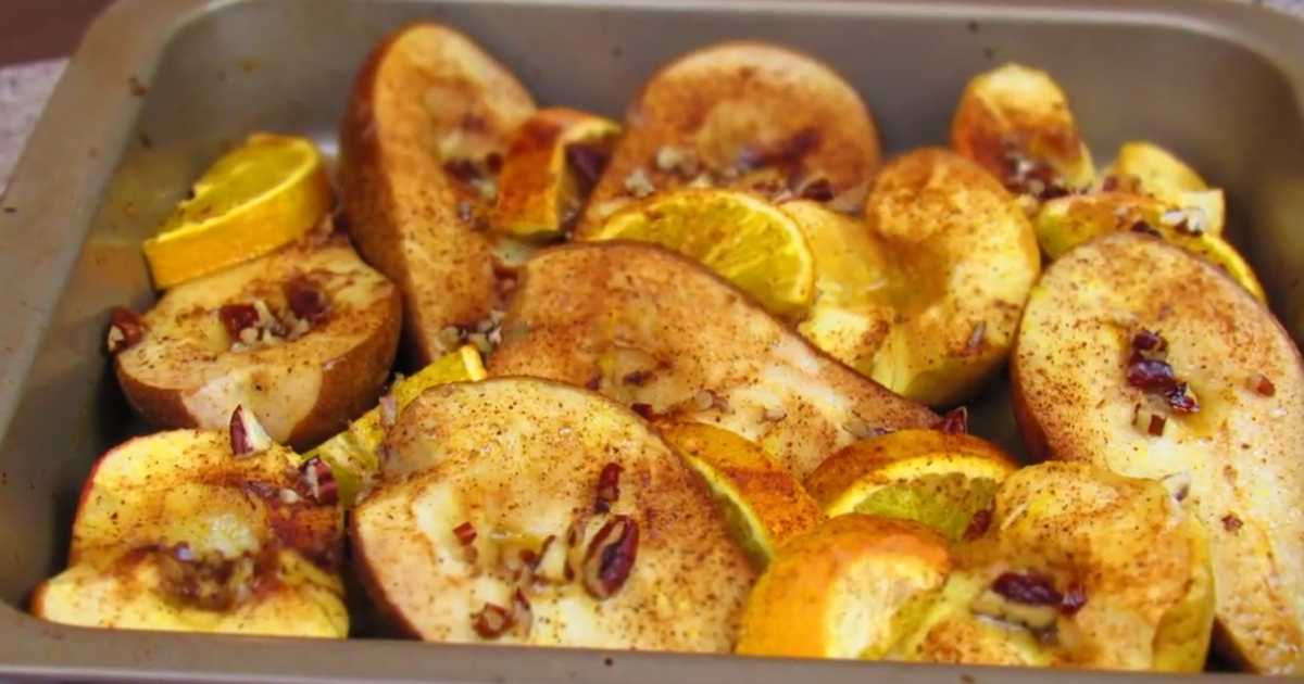 Рецепт берёт начало в традициях домашней европейской кухни, где фрукты запекали с мёдом и орехами как простой, но праздничный десерт. Апельсин добавили позже — с распространением цитрусов в Северной Европе — для свежести и баланса сладости. Такое блюдо часто готовили осенью и зимой, используя сезонные плоды и подчёркивая их вкус натуральными ингредиентами без выпечки.