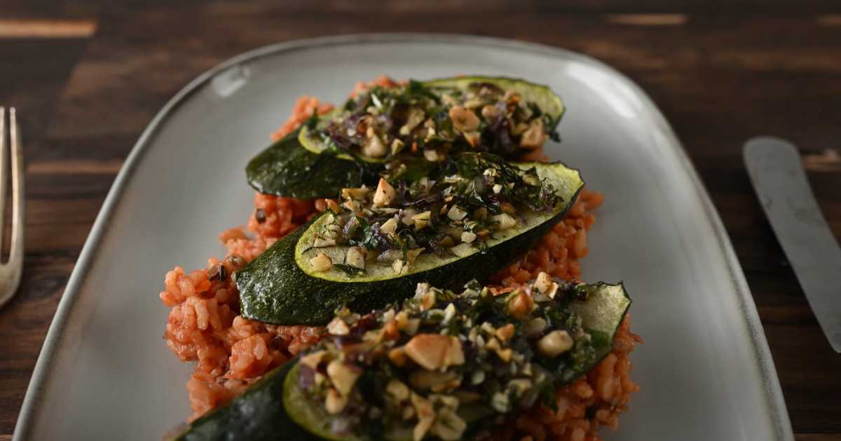 Выложите на тарелку порцию риса, сверху выложите три ломтика кабачка и подавайте.